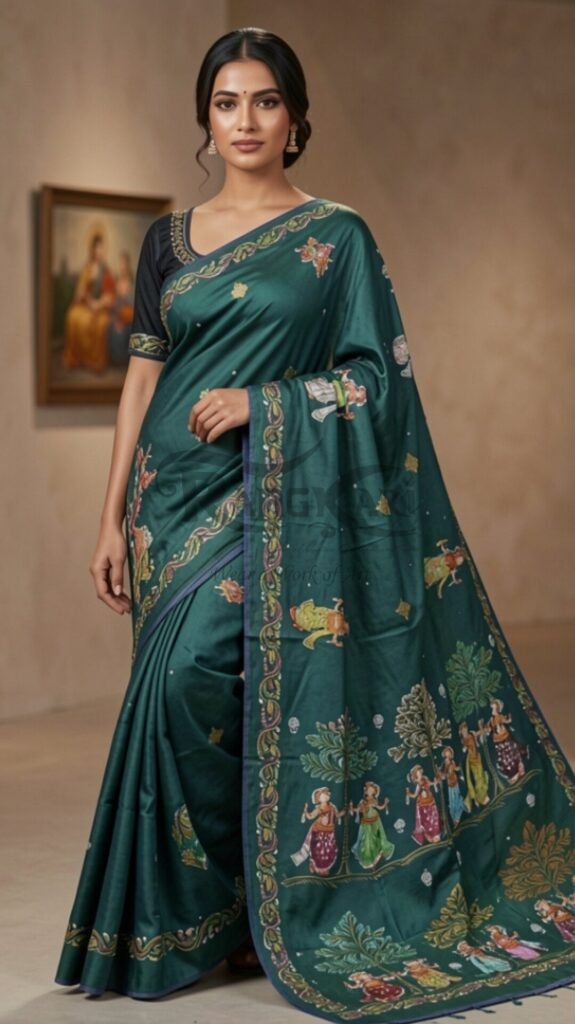 VANA LEELA: The Sacred Grove Handpainted Pure Silk Saree – Nartaki Dancing Design
