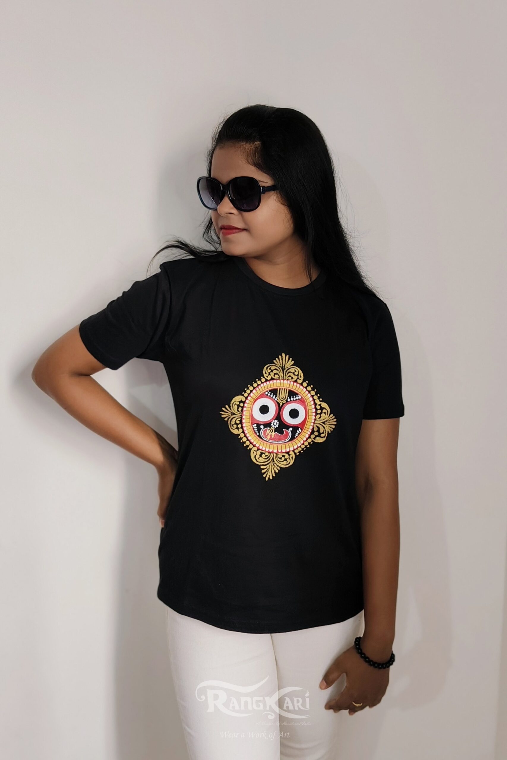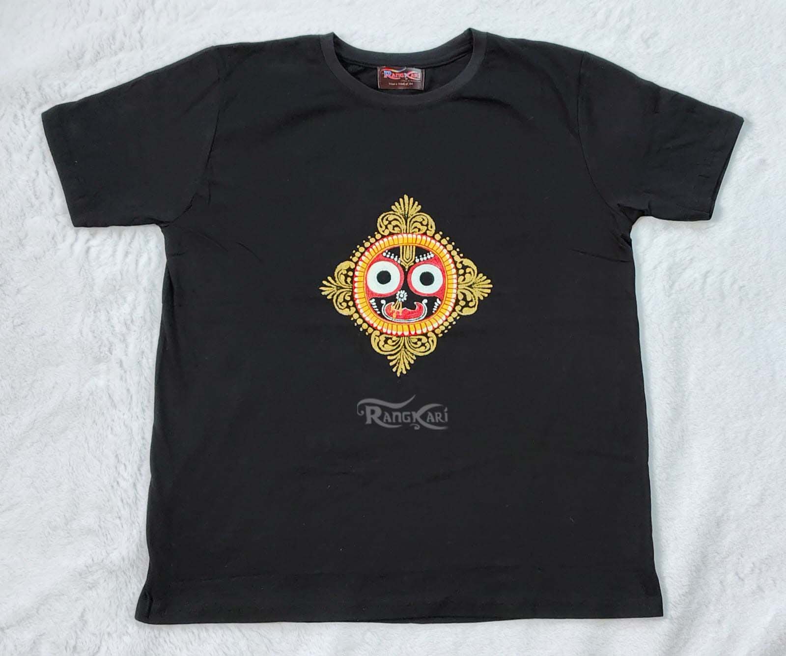 Celebrate tradition with Jaga kalia, a striking black T-shirt featuring Lord Jagannath’s face hand-painted in intricate Patachitra style. The fine detailing and bold strokes bring out the essence of Odisha’s heritage, making this piece a tribute to both art and devotion. The deep black canvas highlights the divine form of Kalia Thakur, blending culture with contemporary fashion.