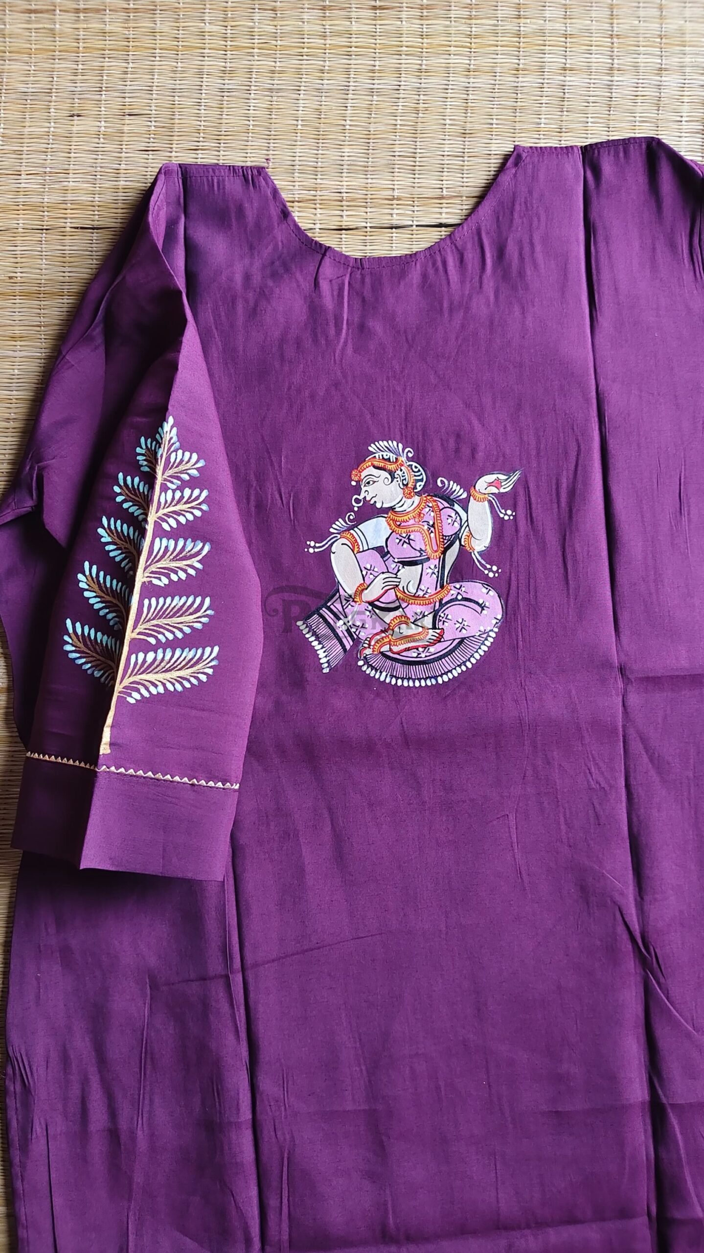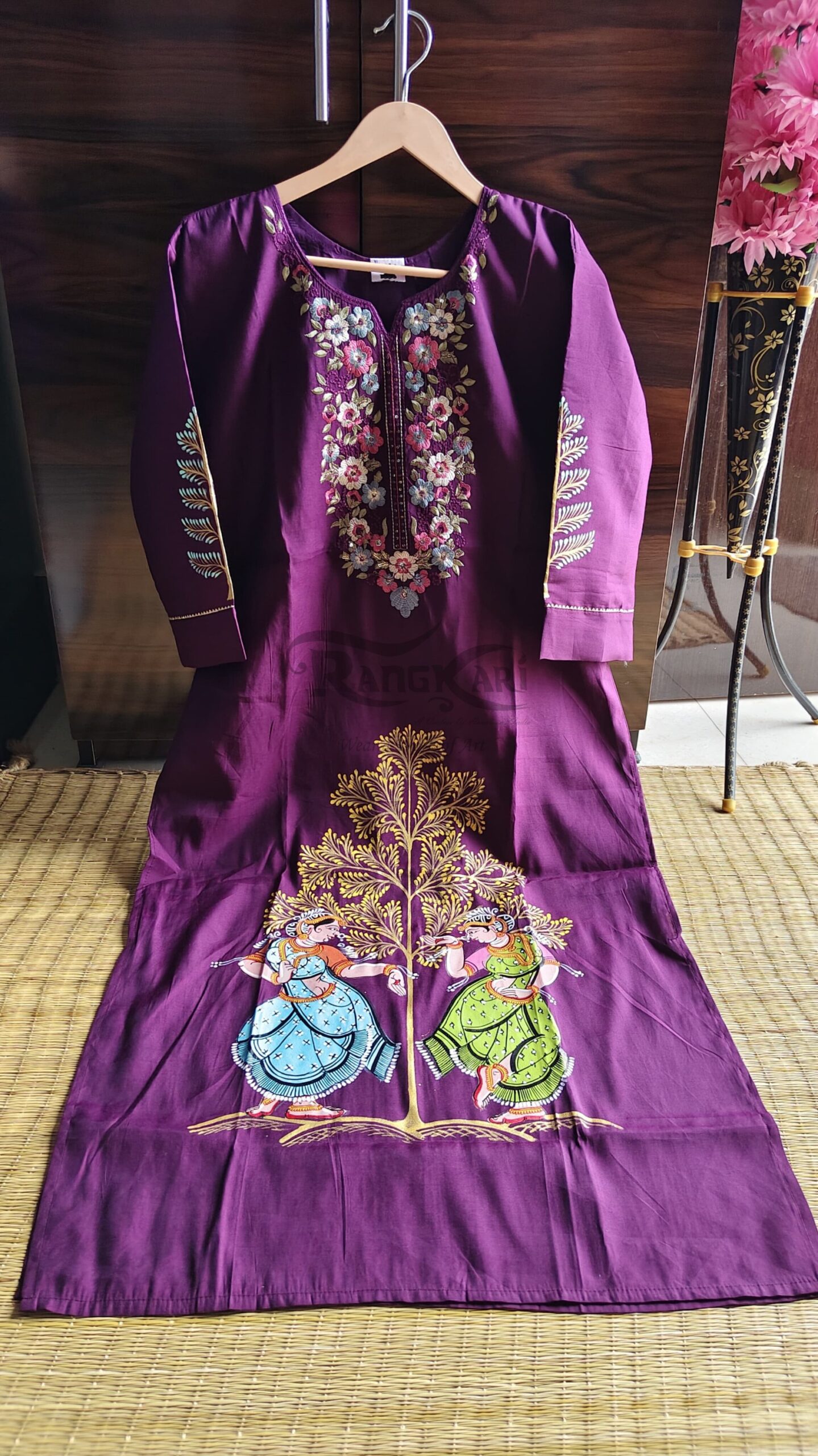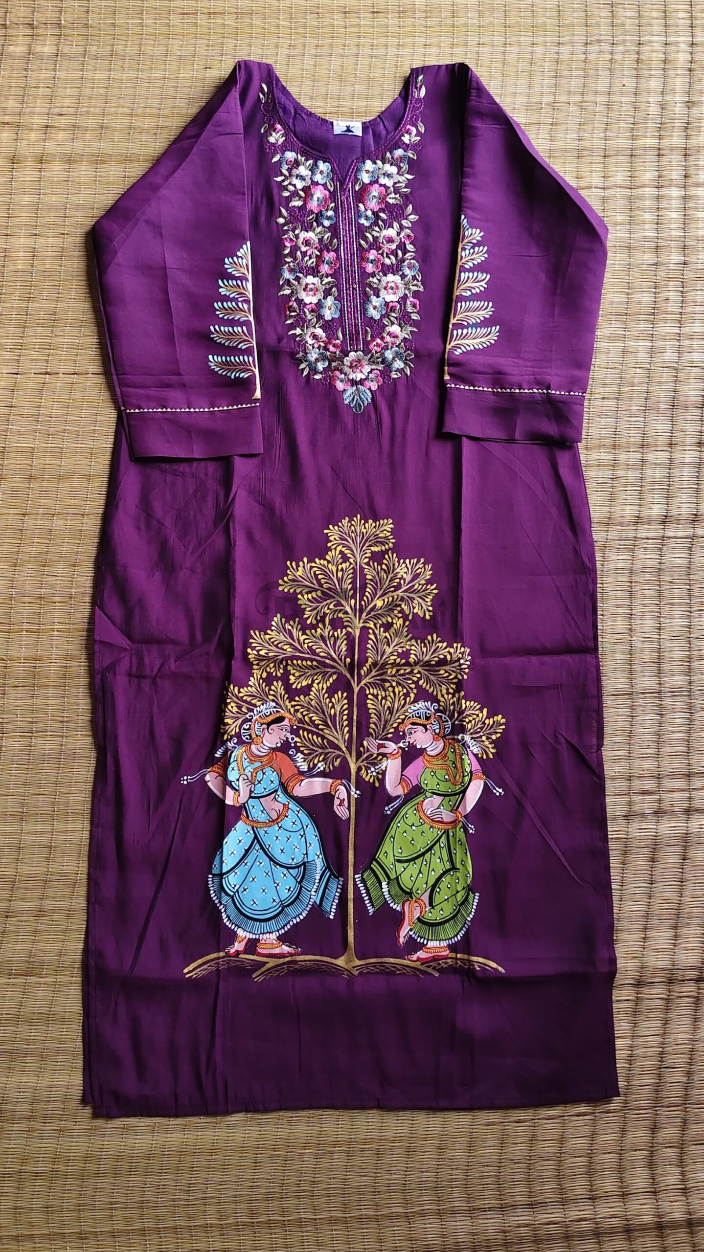 The rich wine hue adds depth and sophistication, perfectly complementing the vibrant handpainted figures and intricate detailing. The kurti is further enhanced with delicate floral embroidery on the neckline, creating a beautiful fusion of handcrafted painting and fine needlework.