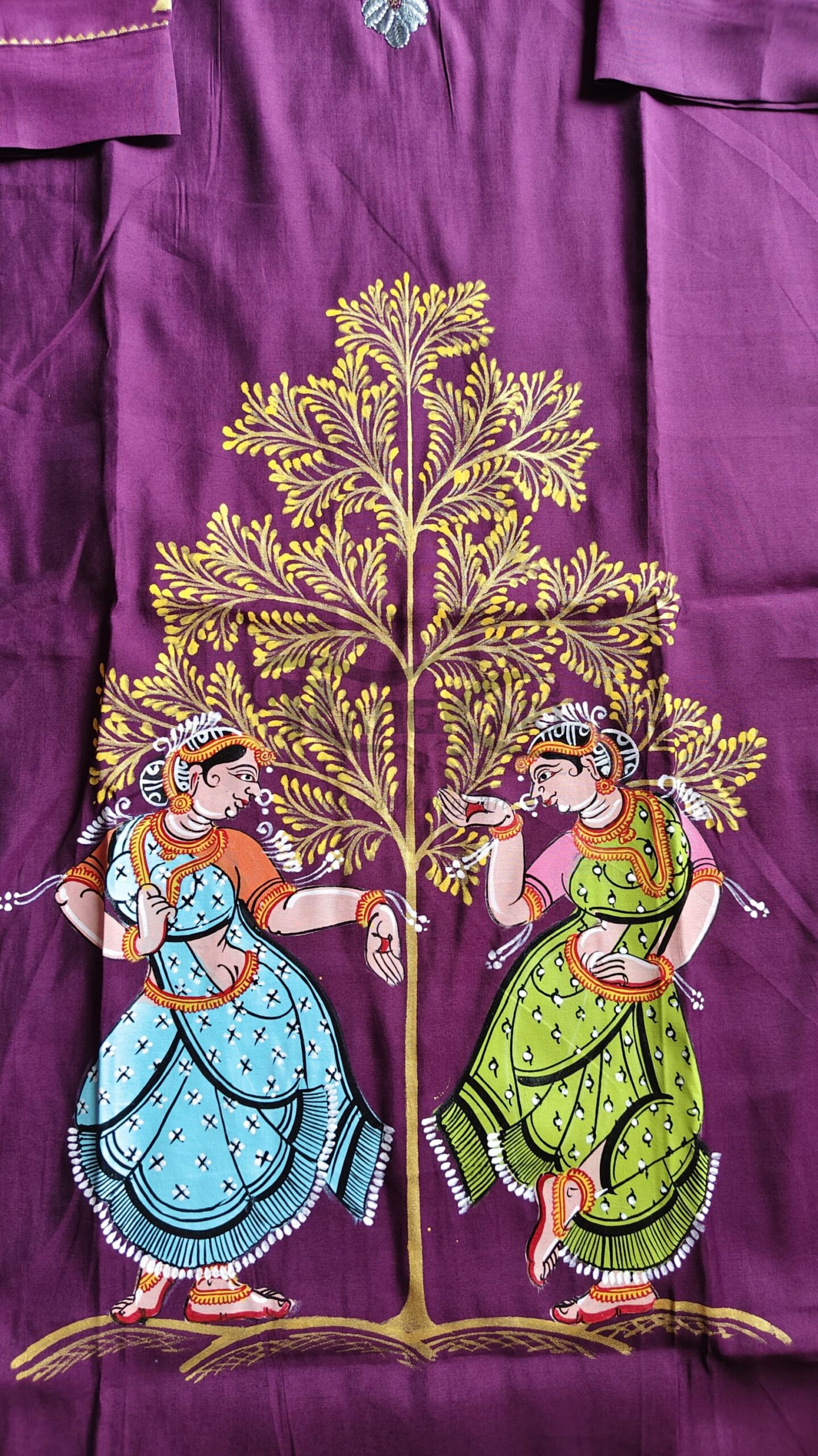 Immerse yourself in the elegance of tradition with this stunning wine-colored Chanderi silk kurti, a true celebration of art and culture. Handpainted in the timeless Pattachitra style, the design features two graceful dancers in a lively Nritya Leela beneath a beautifully detailed Kadamba tree—symbolizing harmony, joy, and divine connection.