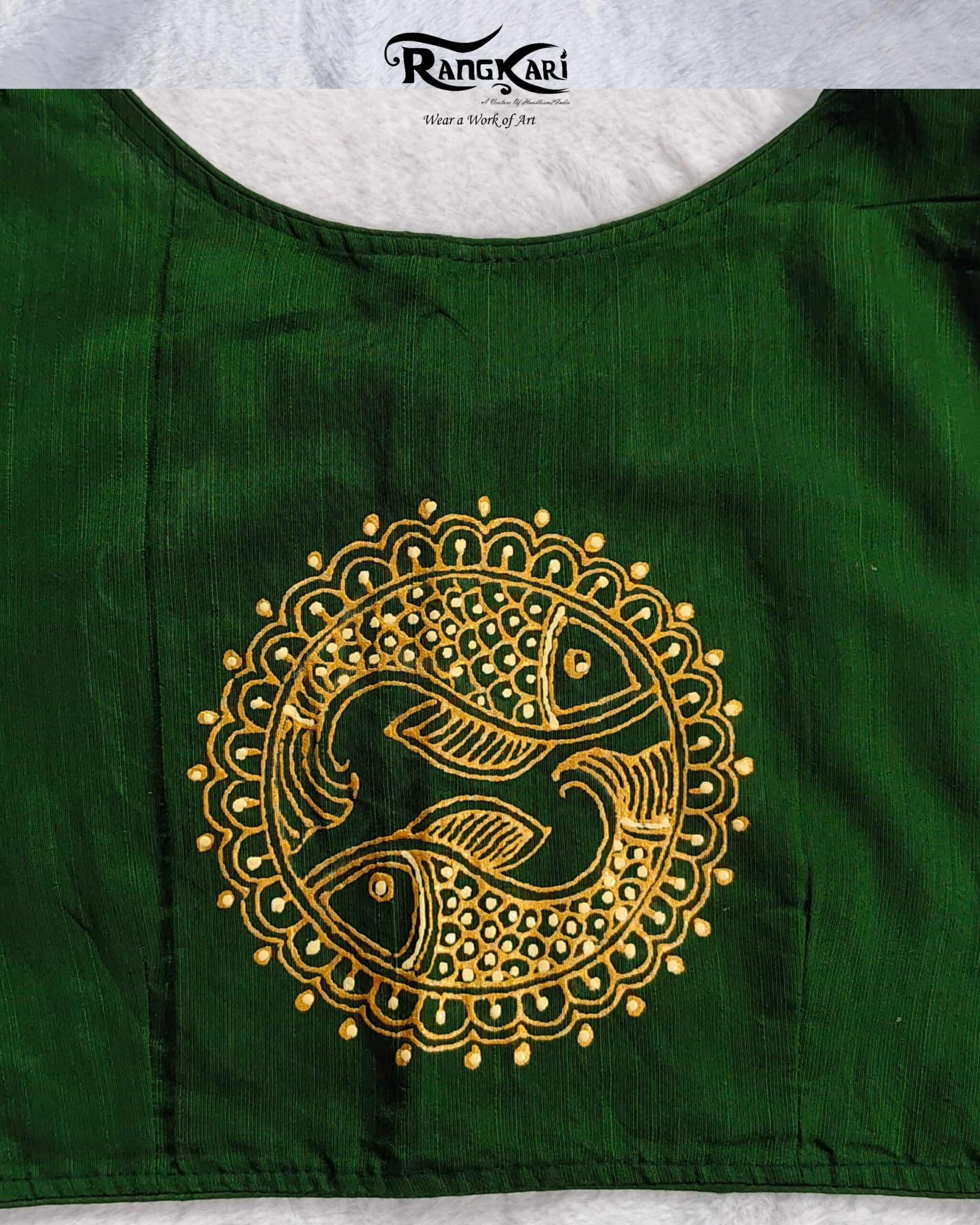 In the rich depth of bottle green raw silk, Matsya Milan comes alive with the timeless Madhubani art of two uniting fishes. Symbolizing harmony, prosperity, and the eternal flow of life, this hand-painted masterpiece captures the essence of tradition with a touch of modern elegance. The smooth sheen of raw silk enhances the vibrant strokes, making it a statement piece for festive and cultural occasions.