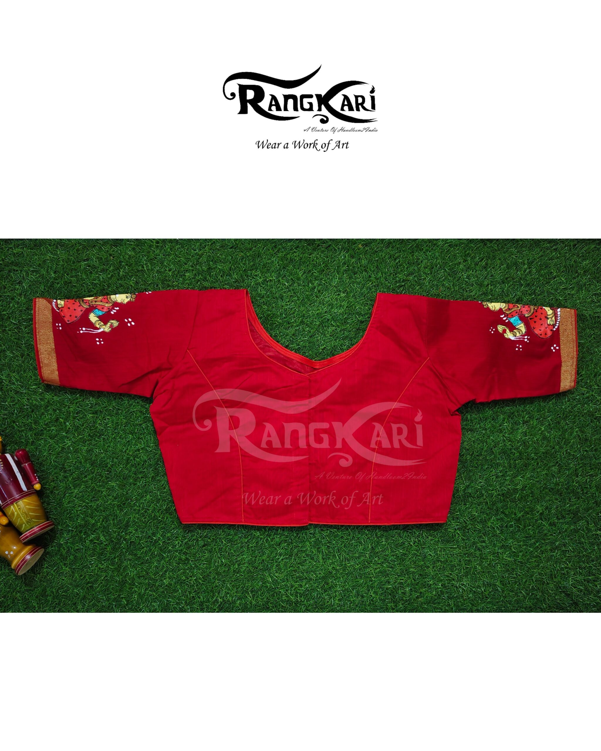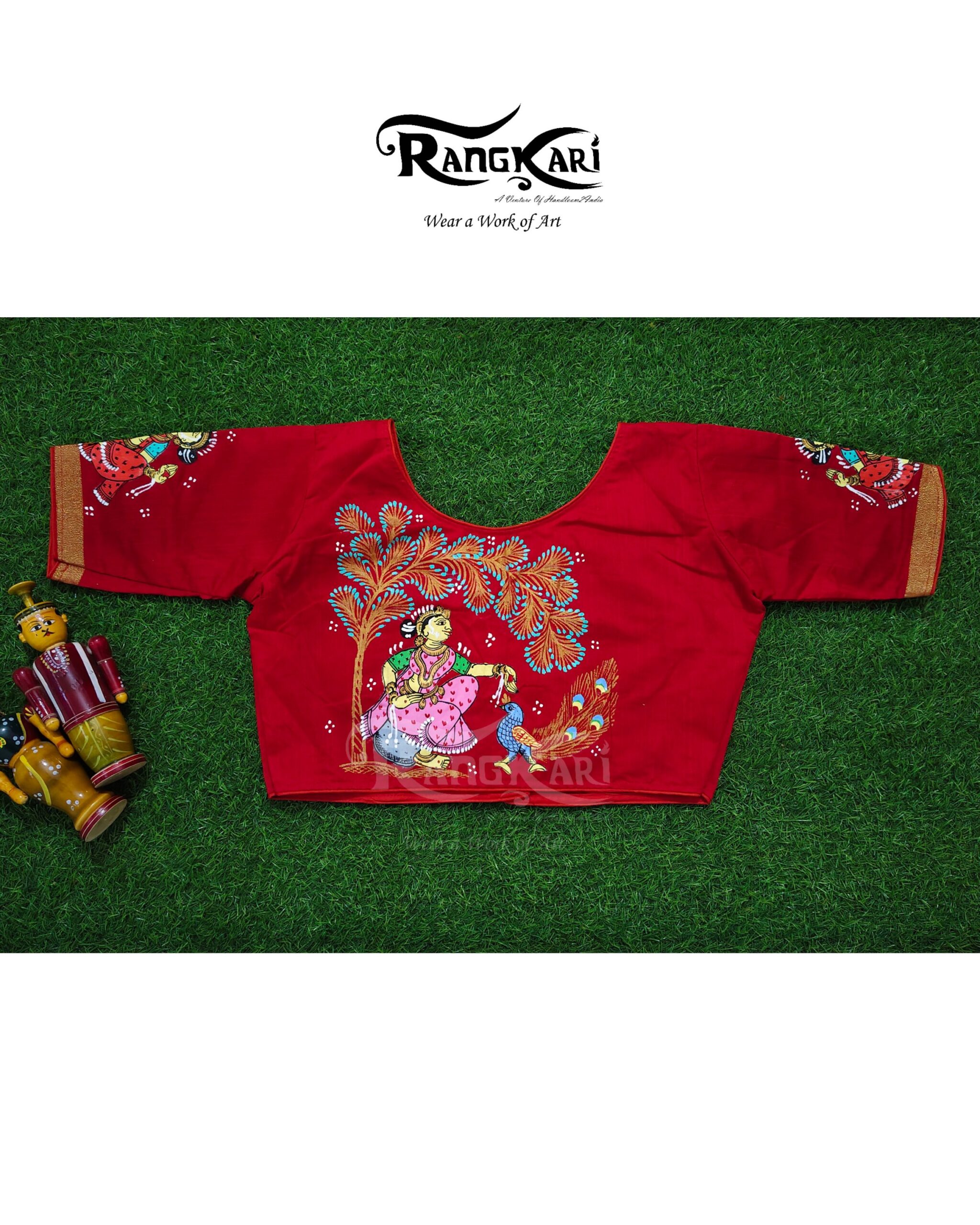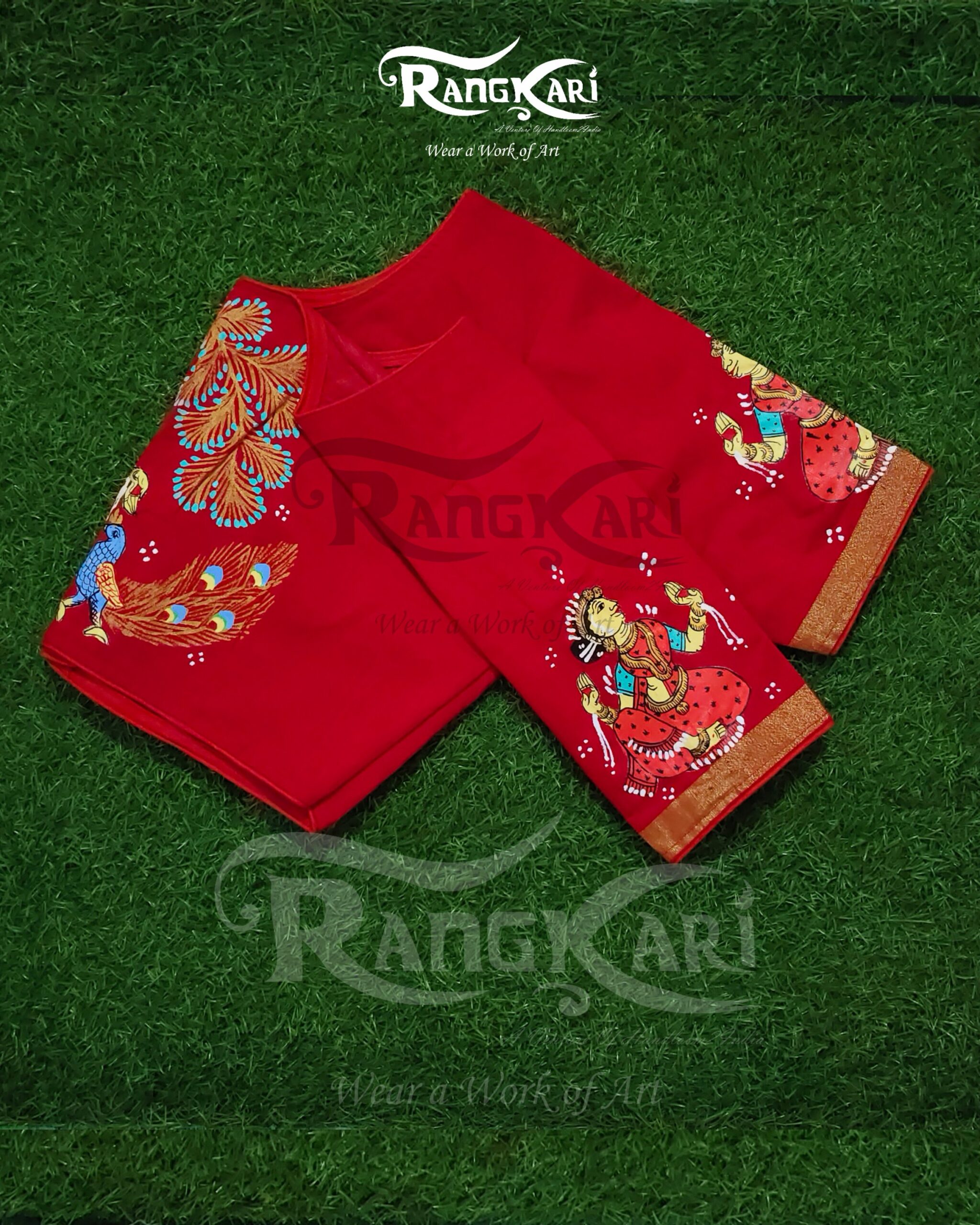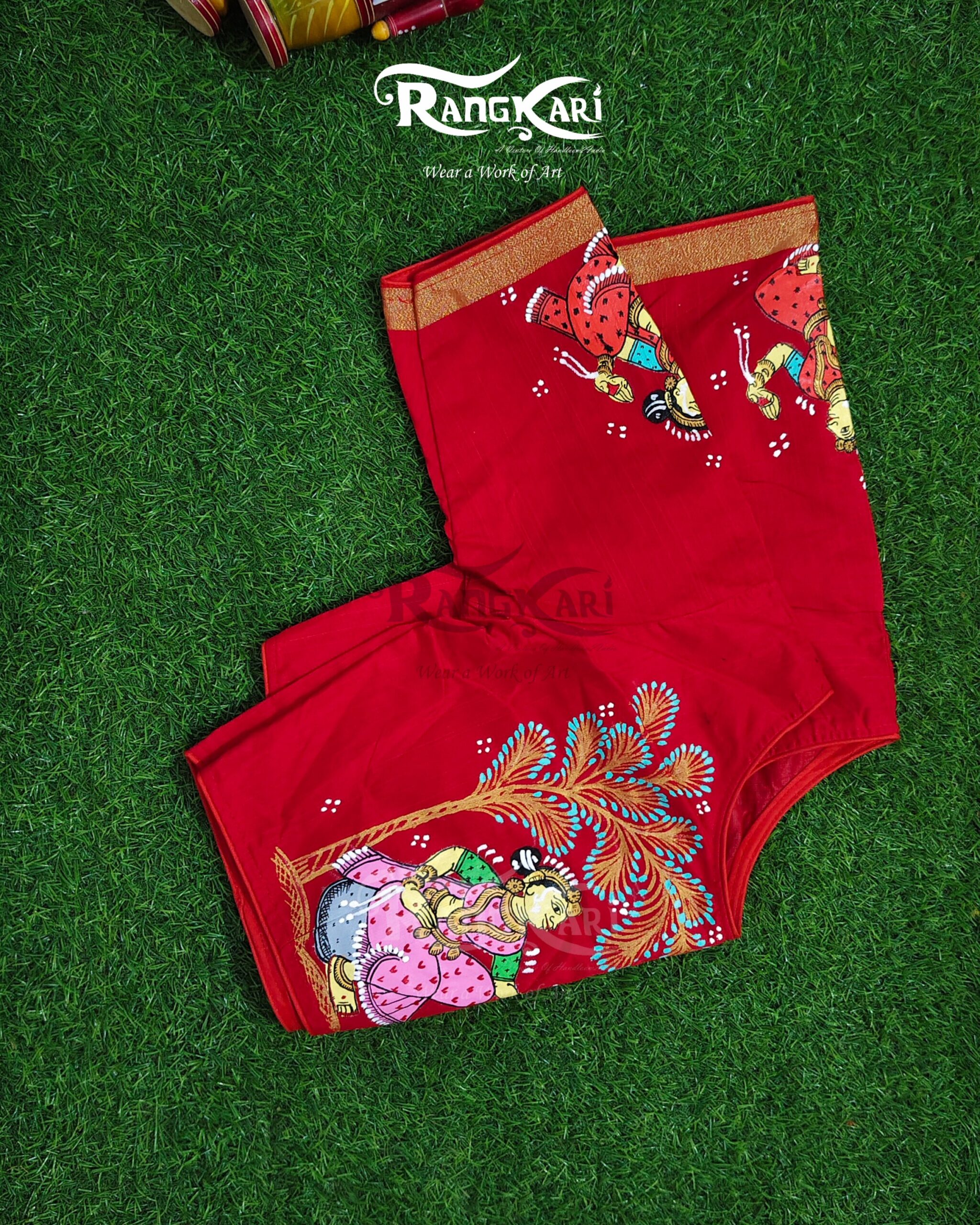 Every brushstroke reflects traditional storytelling, where nature and human emotion exist in perfect harmony. The rich red base enhances the vibrancy of the hand-painted motifs, making the blouse a striking statement piece while remaining rooted in cultural elegance.