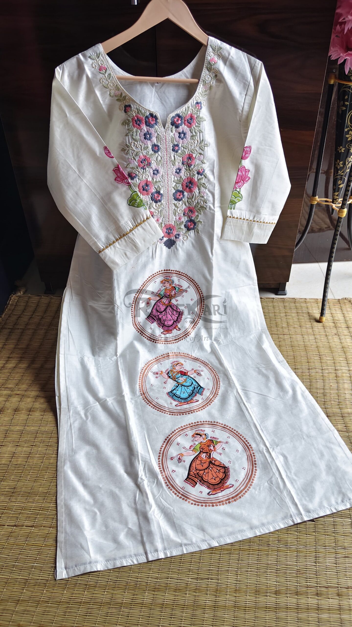 The soft off-white base enhances the vibrancy of the artwork, while the delicately embroidered floral neckline adds a touch of sophistication and femininity. Crafted from premium Chanderi silk, this kurti offers a lightweight feel with a subtle sheen, making it ideal for both festive gatherings and refined daywear.