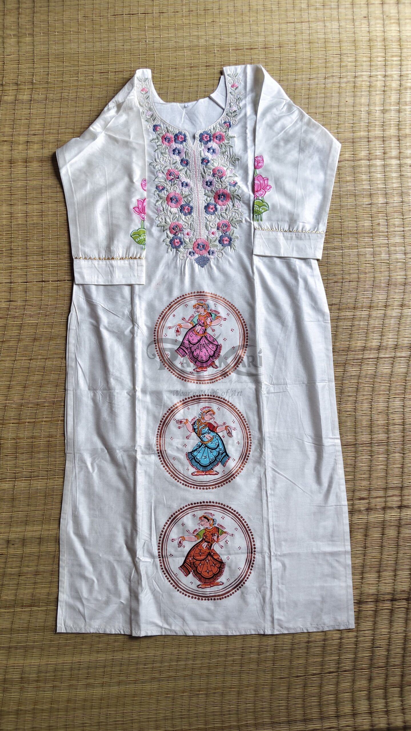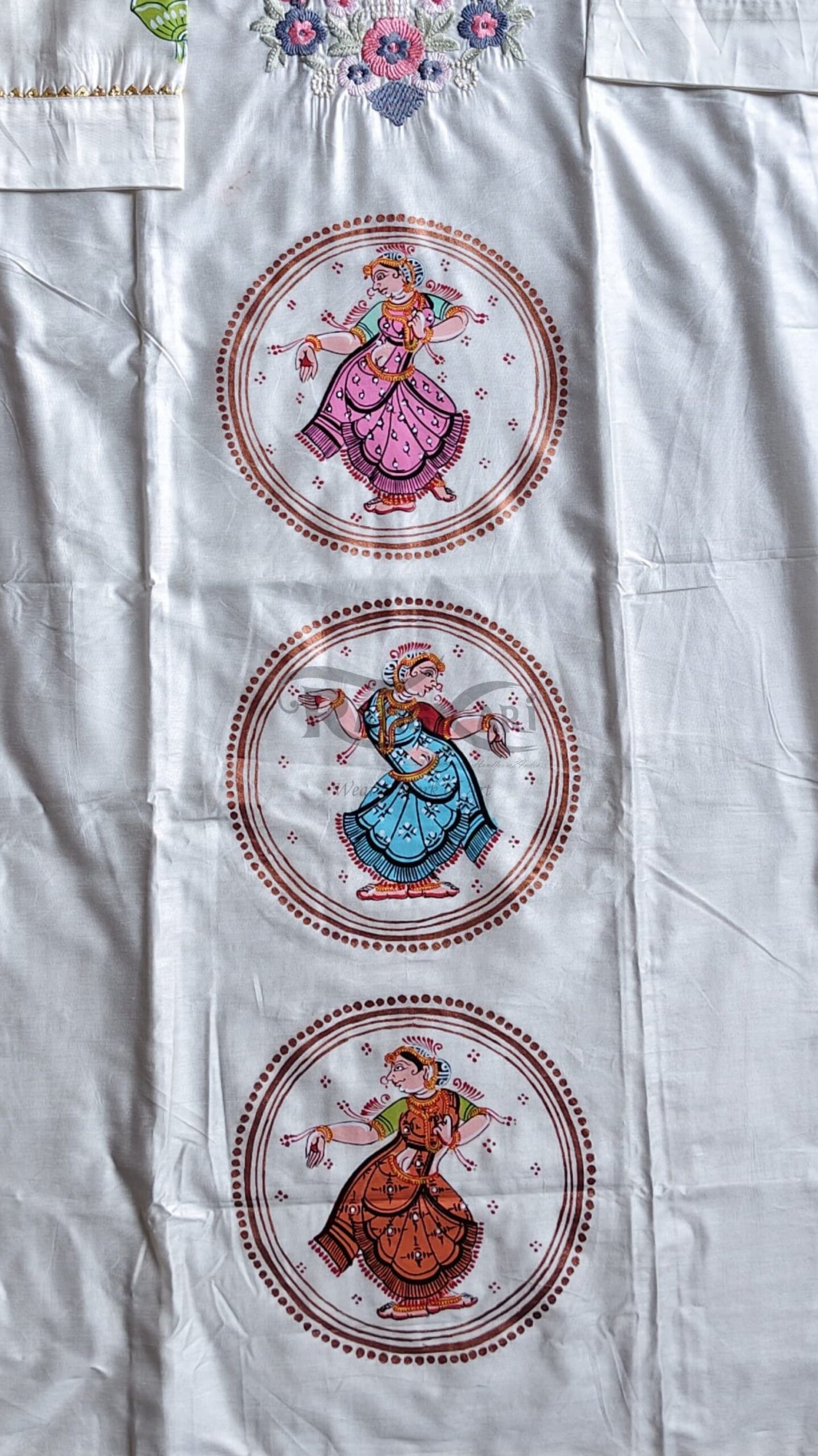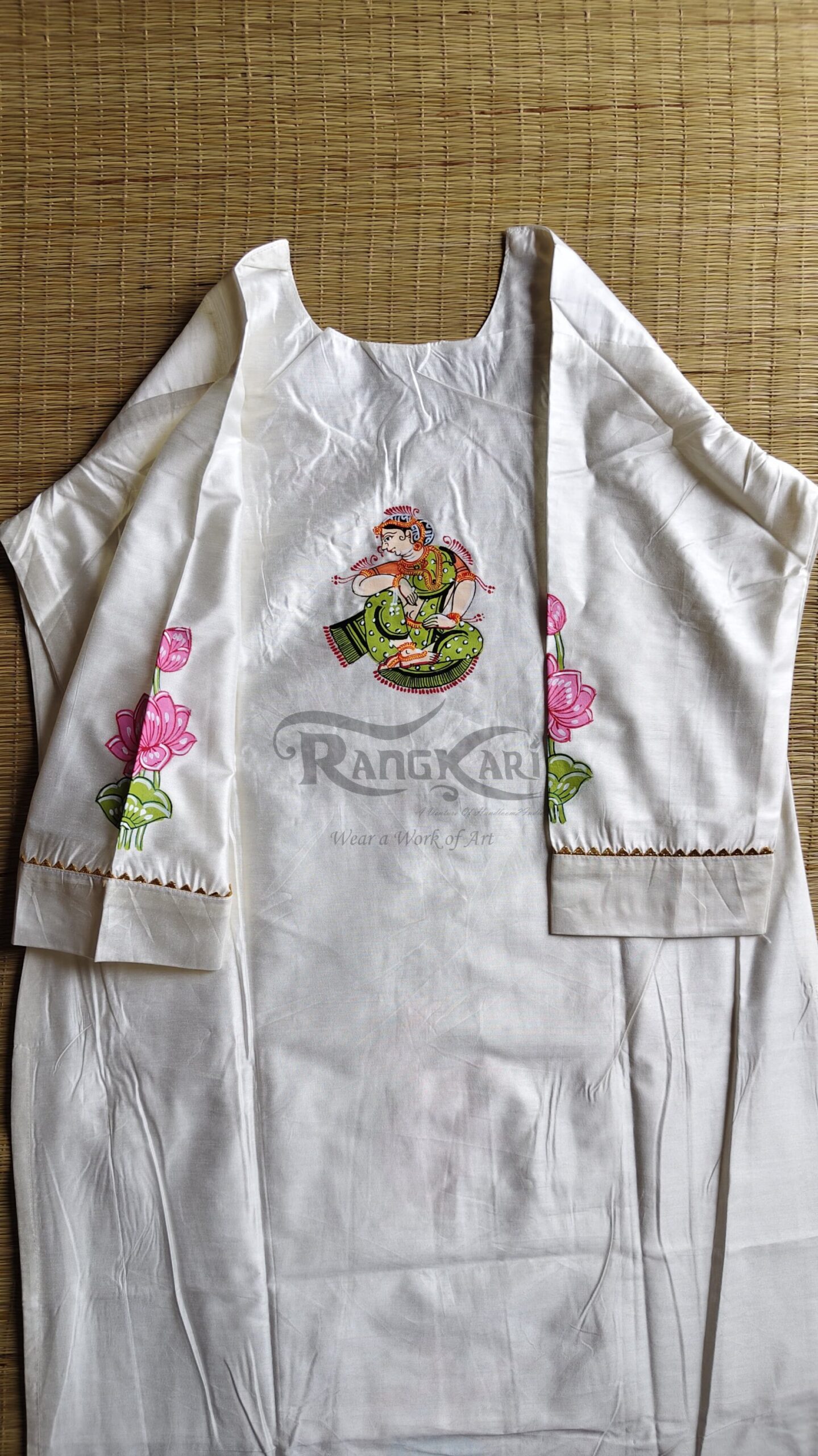 Grace meets storytelling in this elegant off-white Chanderi silk kurti, a perfect blend of heritage art and contemporary charm. Adorned with handpainted Pattachitra motifs, the design beautifully captures a sequence of graceful dancing figures arranged in circular frames—each reflecting rhythm, expression, and the spirit of classical Indian artistry.