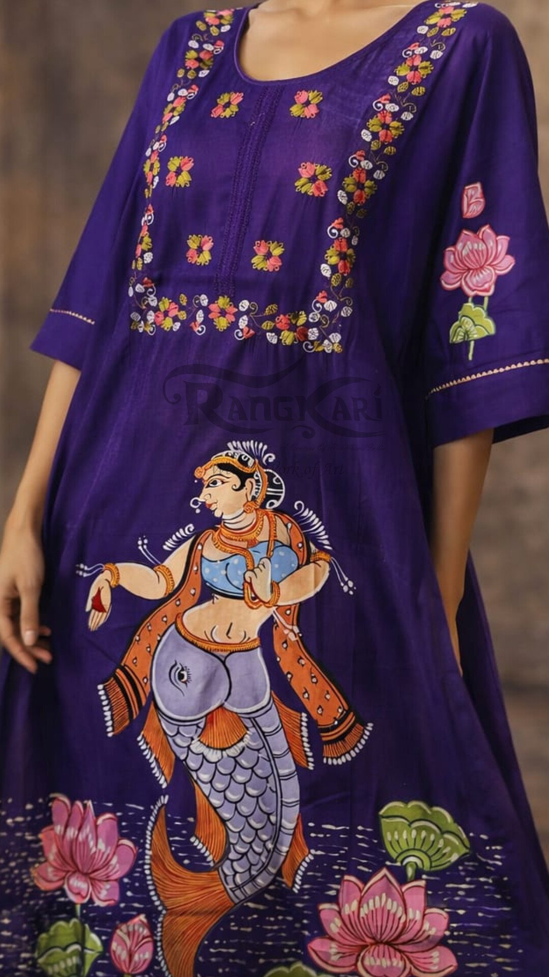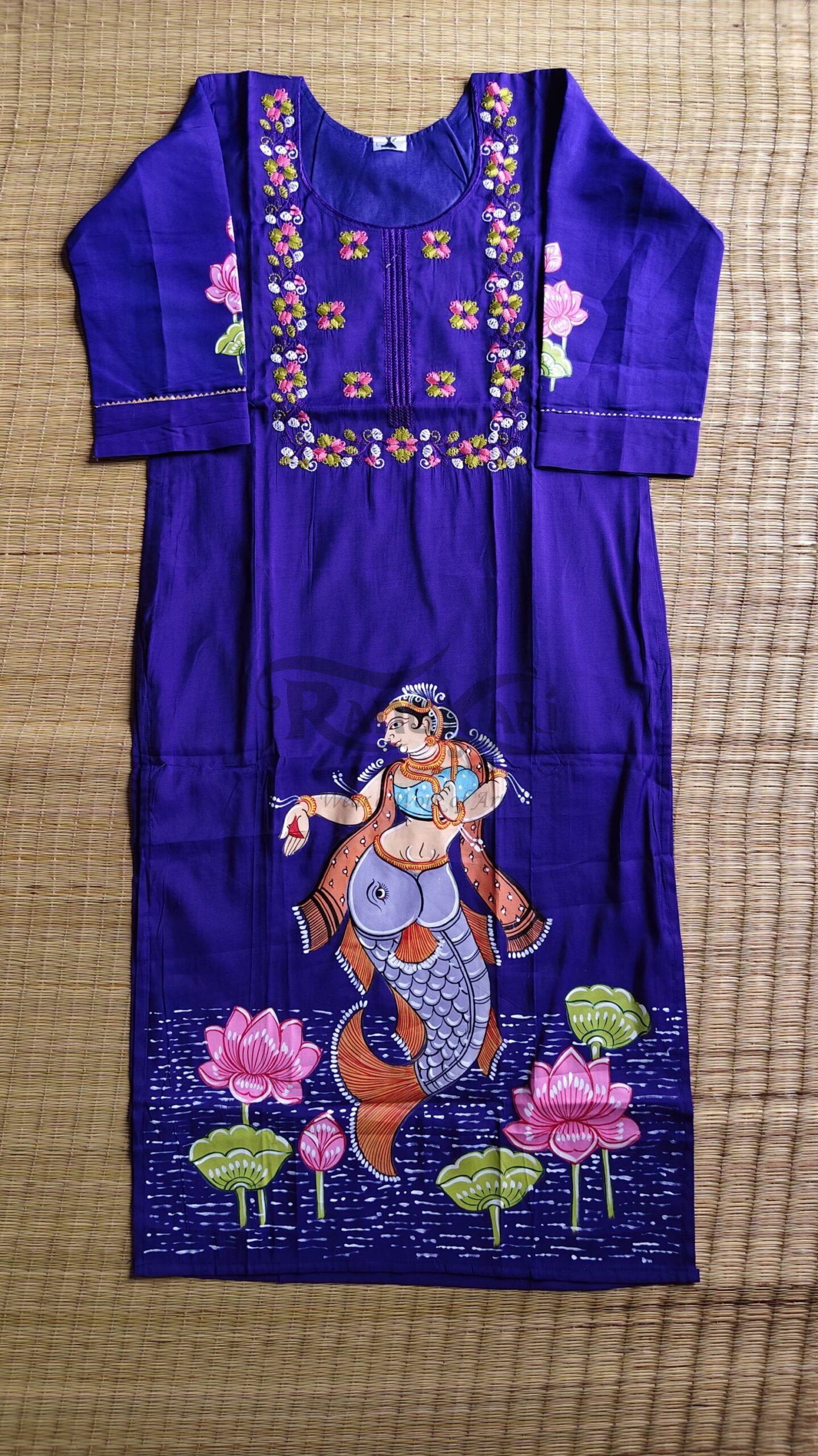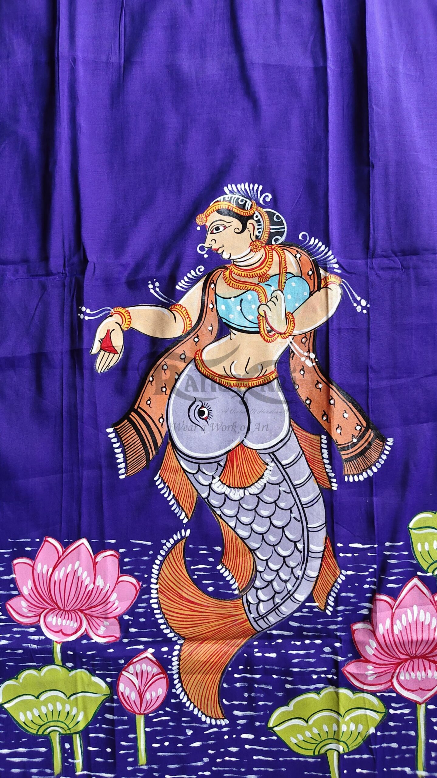 Drape yourself in art with this exquisite Purple Chanderi silk kurti, where tradition meets timeless elegance. Handpainted in the intricate Pattachitra style, the design beautifully narrates a graceful Matsya Leela (fish-inspired motif) surrounded by blooming lotus elements—symbolizing purity, fluidity, and life.