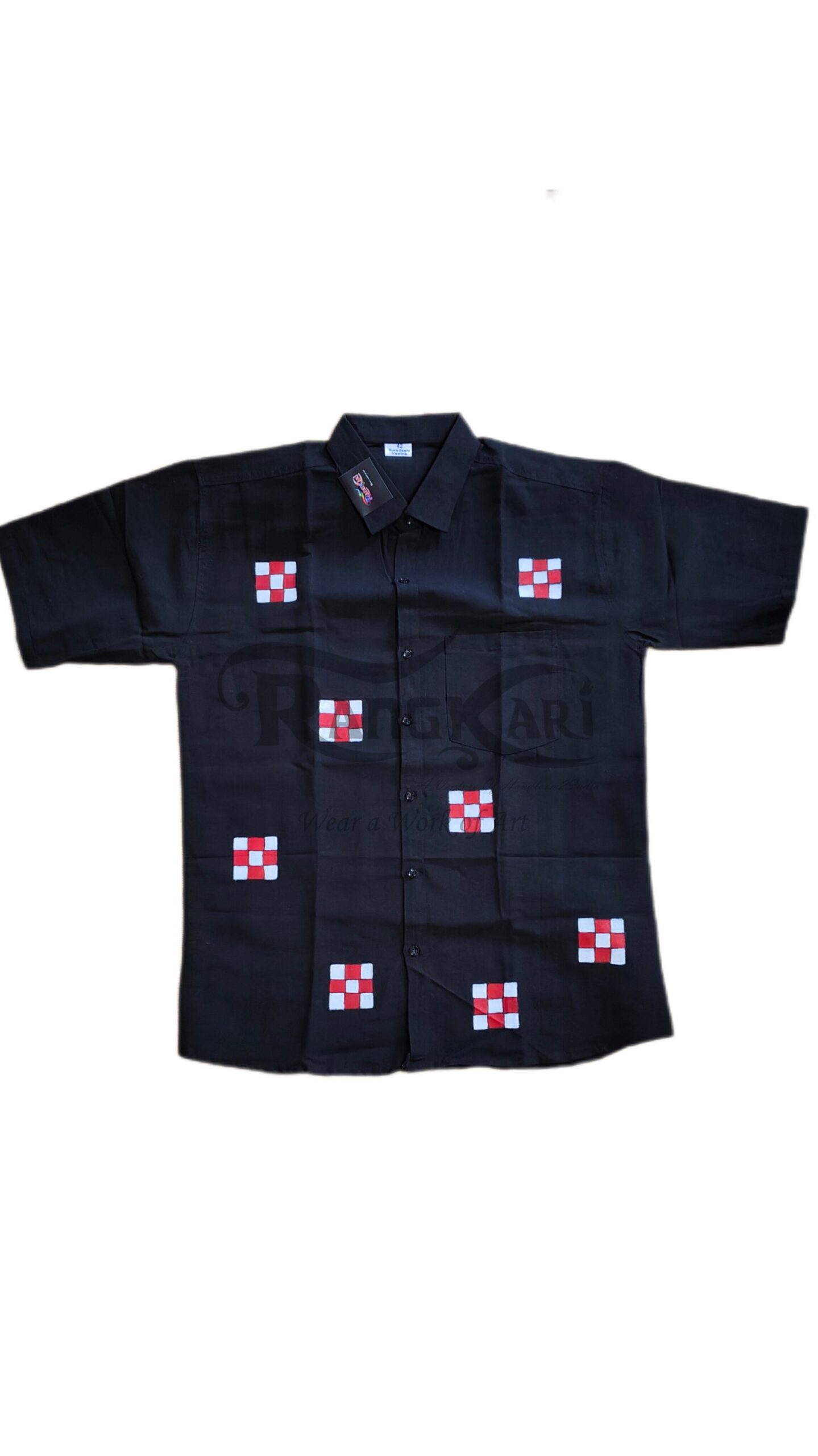 Set against a deep black canvas, the striking red and white patterns create a powerful visual contrast, embodying strength and sophistication. Every detail is crafted by hand, turning this shirt into a seamless blend of tradition and modern luxury.