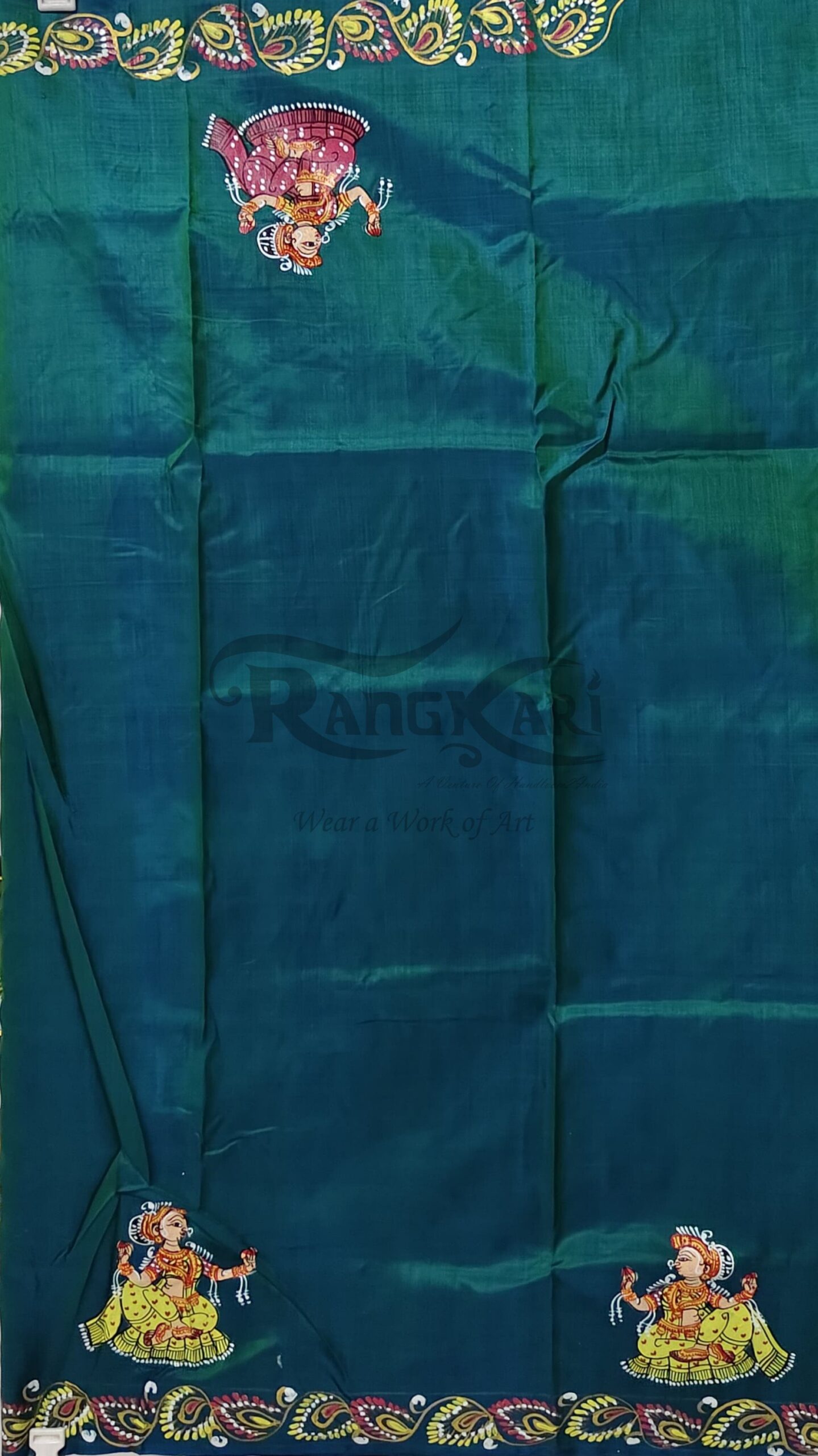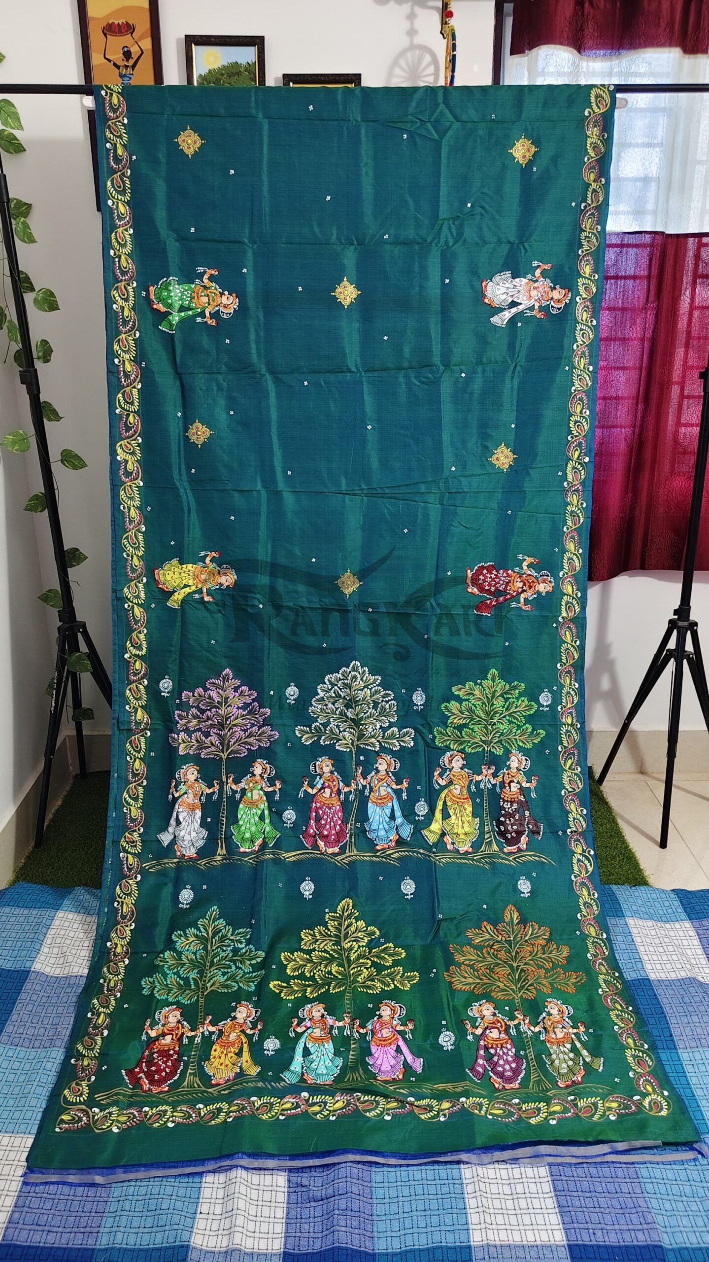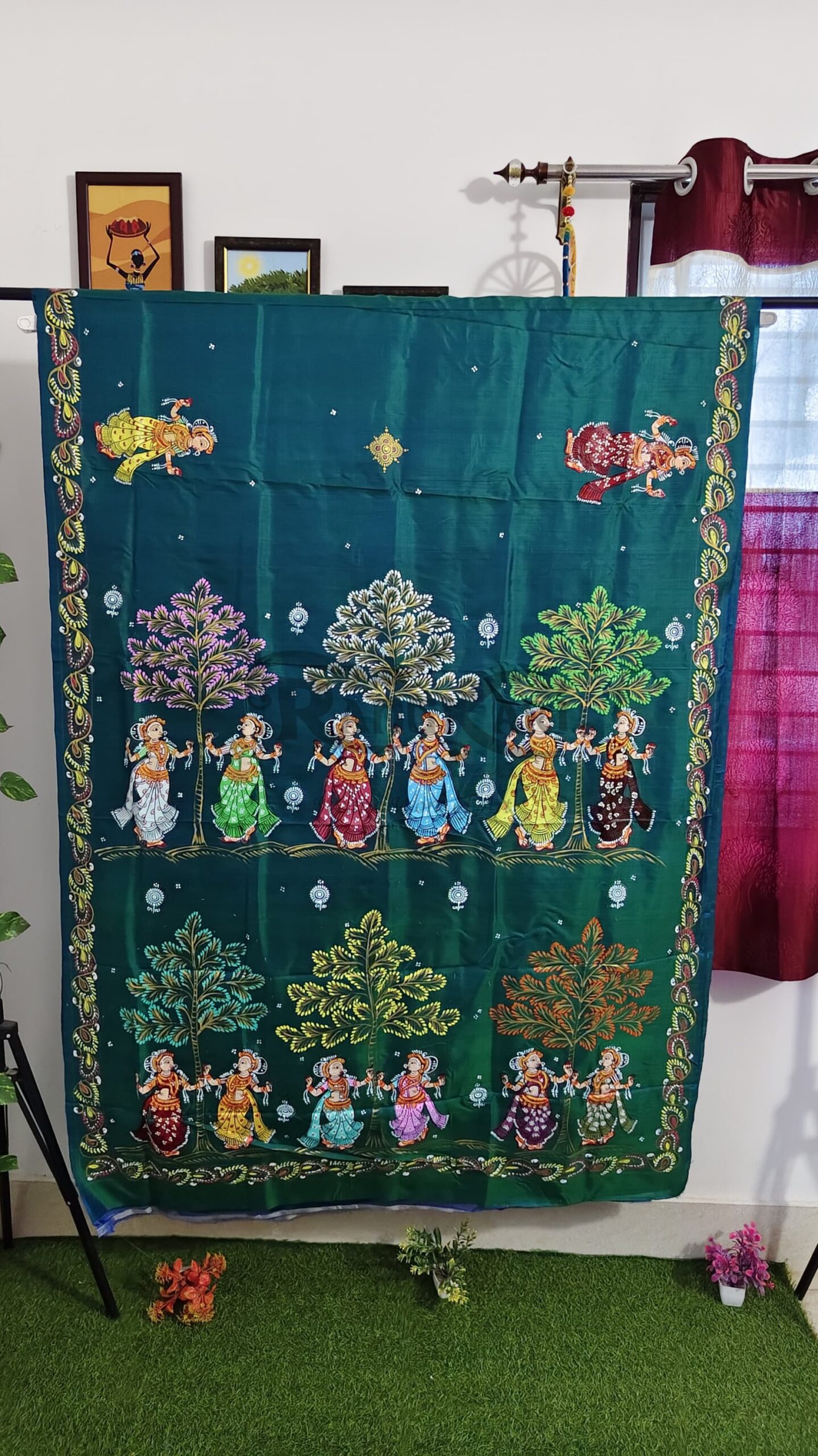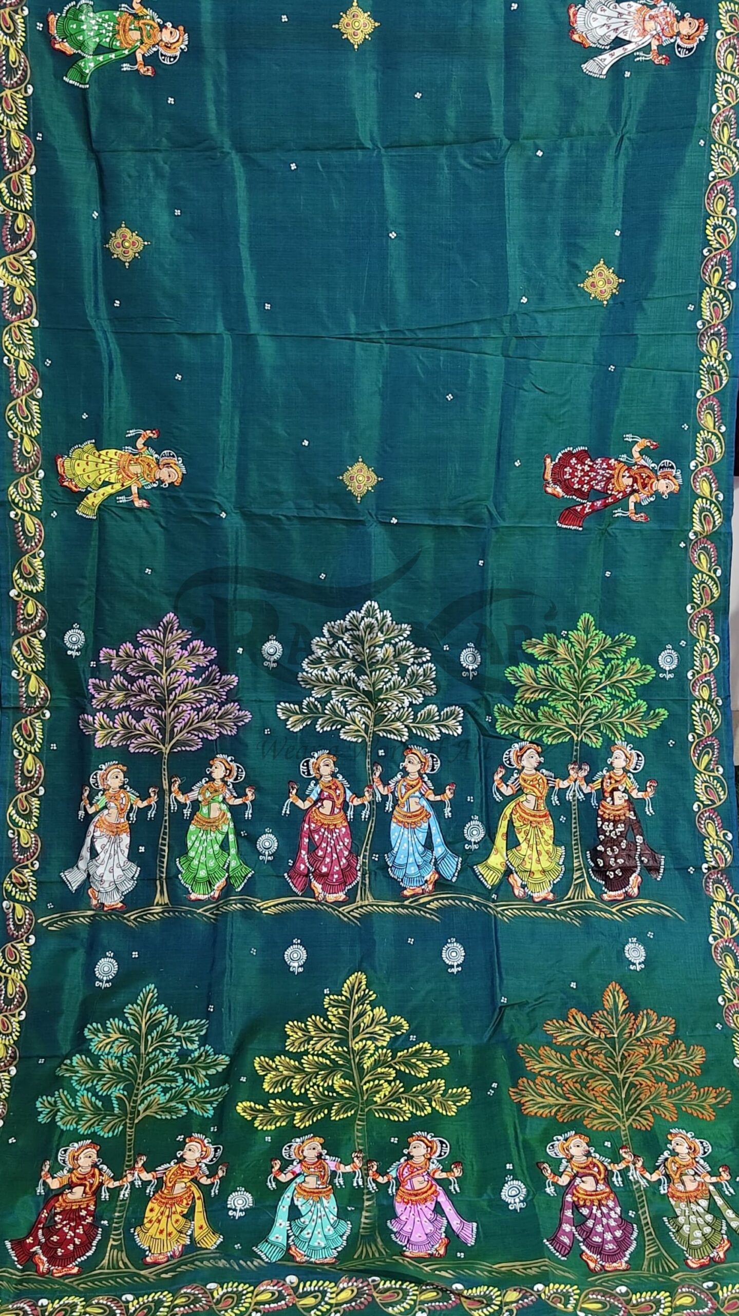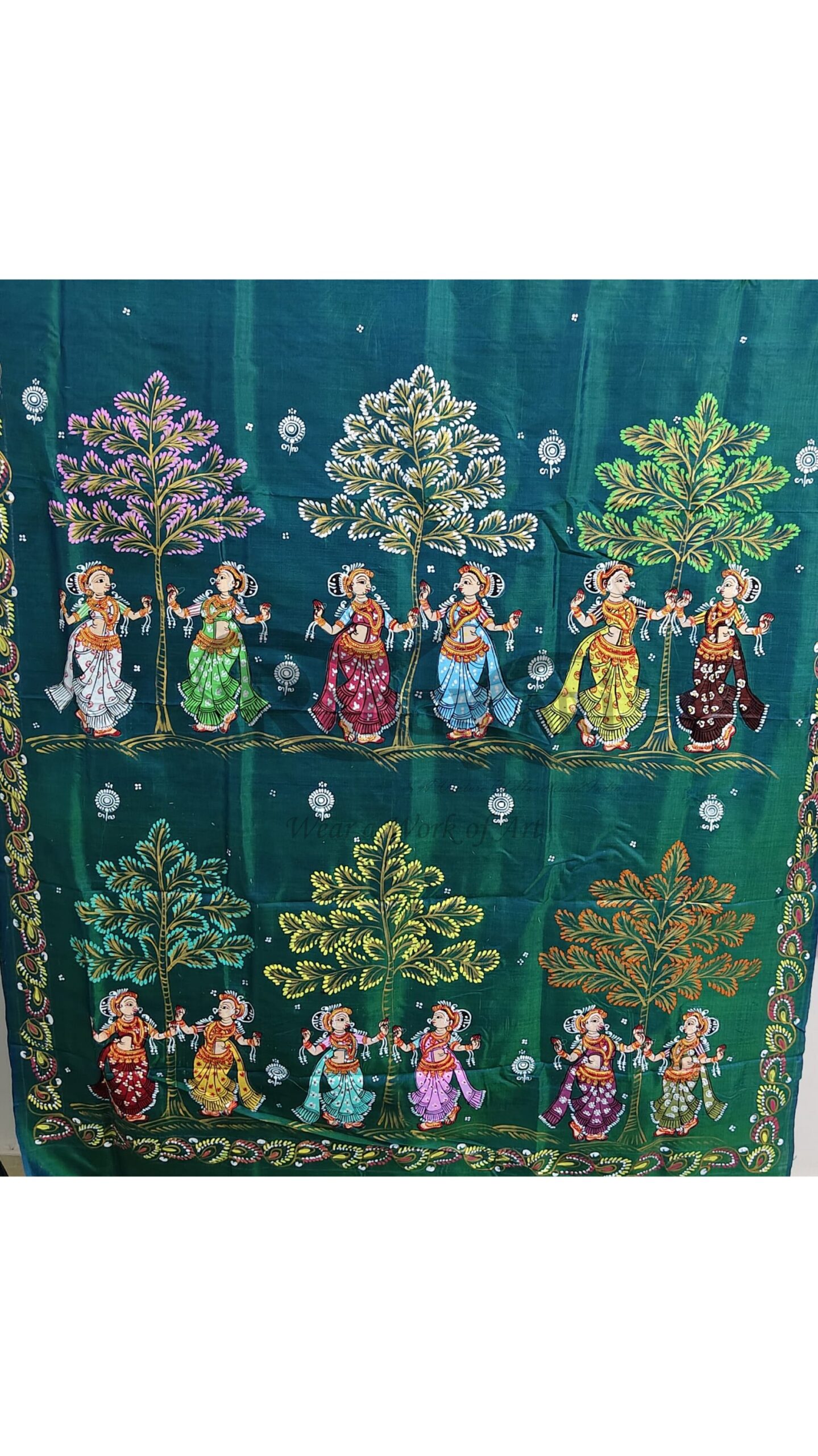 In the tradition of Pattachitra, Vana Leela depicts the rhythmic celebration of life within a hallowed grove. The pallu features two majestic tiers of women in traditional attire, dancing in joyous unison under the shade of ornate, multi-colored trees. Their expressive postures capture a moment of pure, earthly devotion.