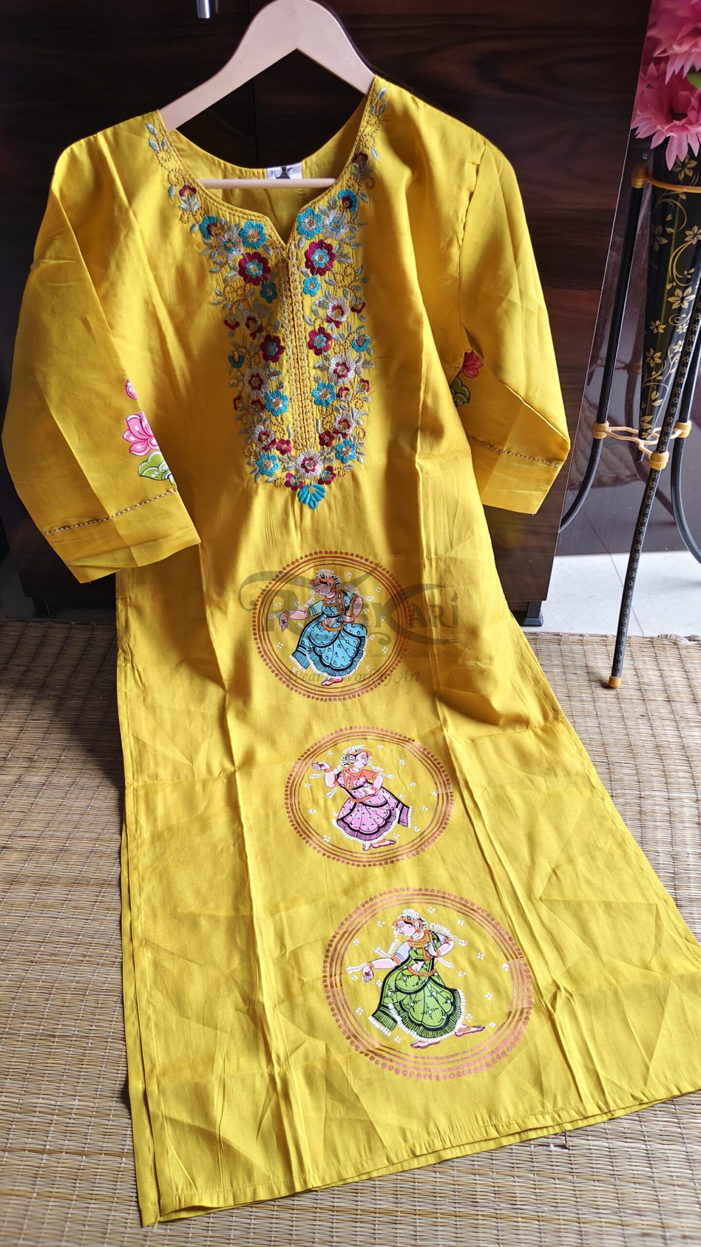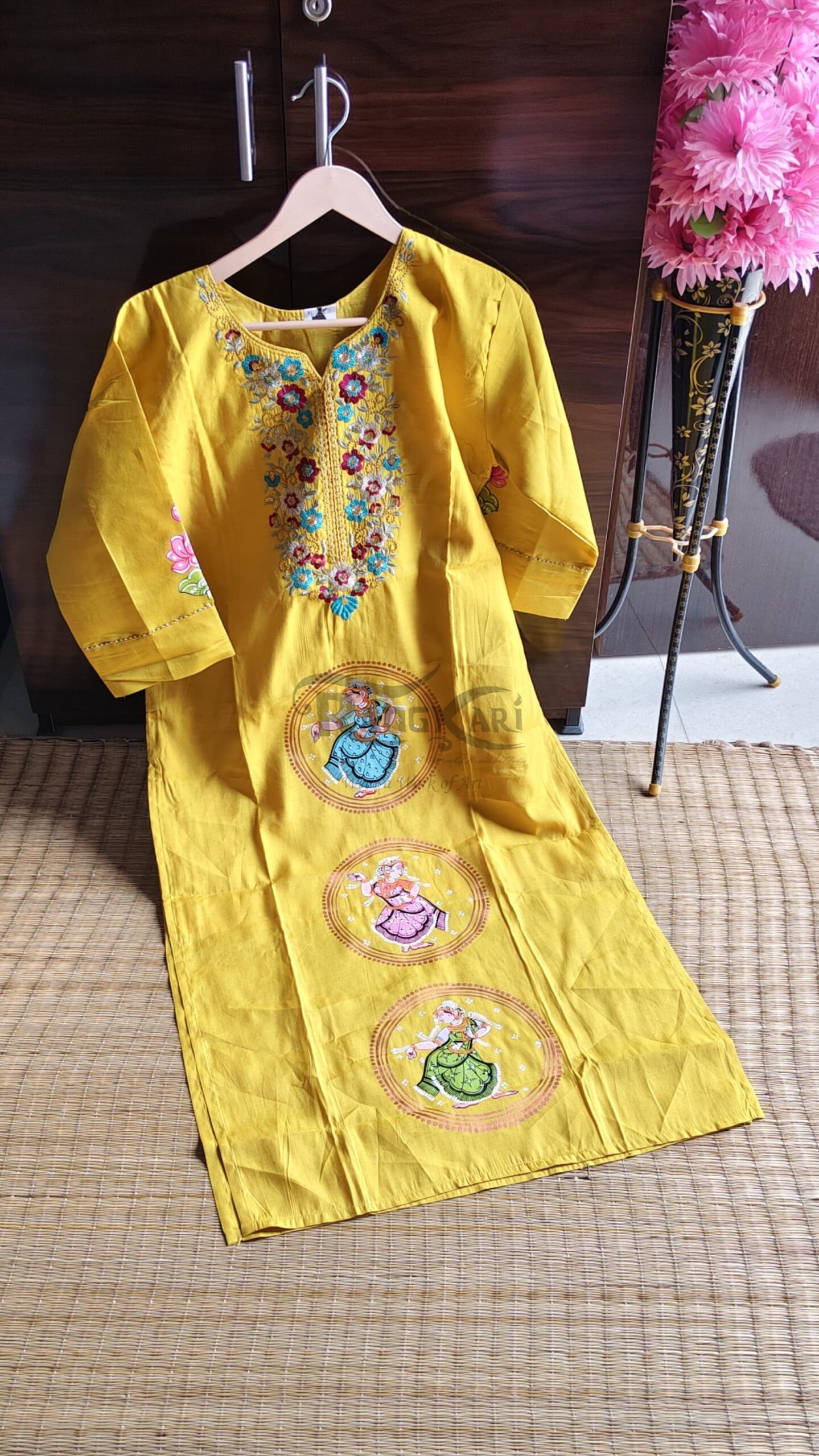 The refreshing lemon yellow hue adds a lively charm, making it a perfect choice for daytime festivities and elegant gatherings. The kurti is further enhanced with finely detailed floral embroidery on the neckline, creating a harmonious fusion of handpainting and delicate craftsmanship.