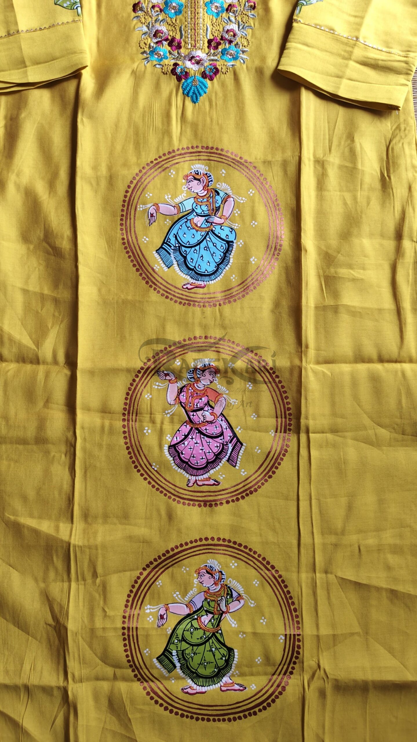 Radiating brightness and joy, this lemon yellow Chanderi silk kurti is a beautiful expression of tradition blended with elegance. Handpainted in the intricate Pattachitra style, the design showcases a series of graceful dancing figures enclosed in circular motifs—each capturing the rhythm, movement, and storytelling essence of classical Indian art.