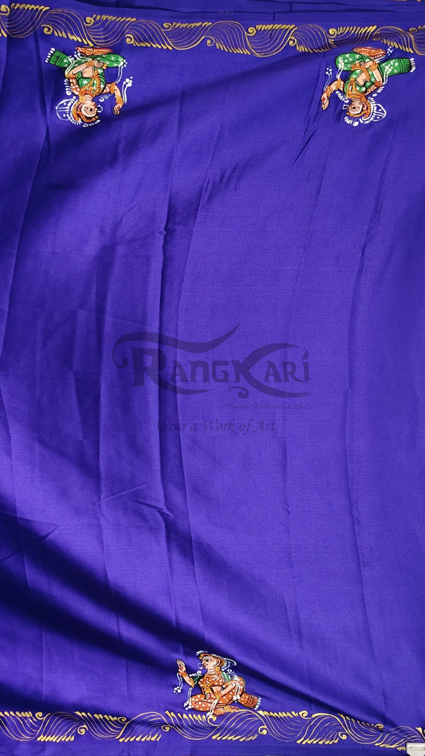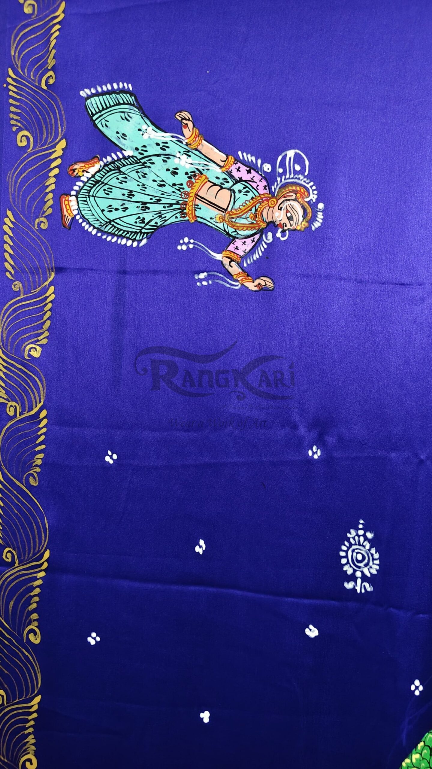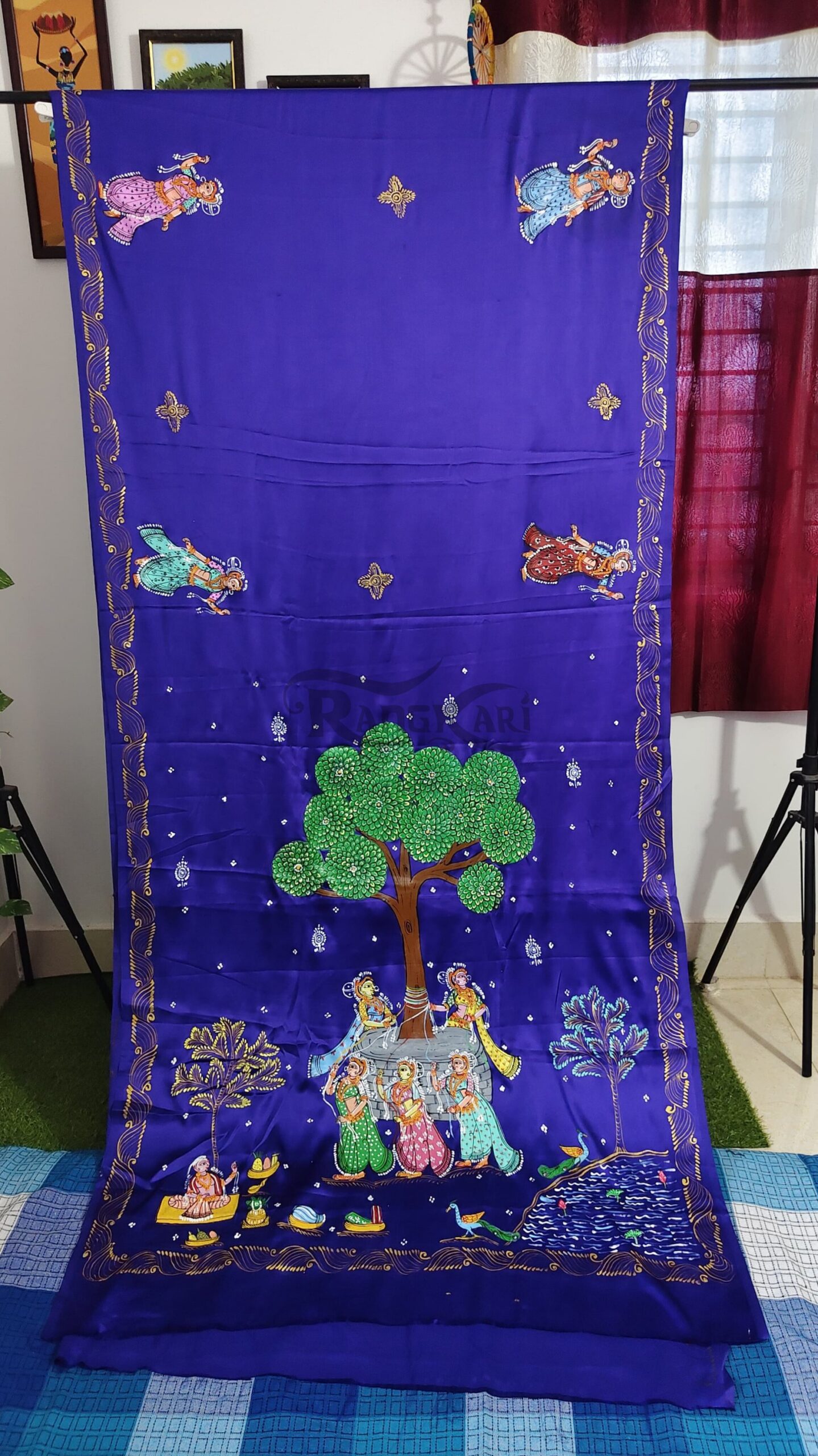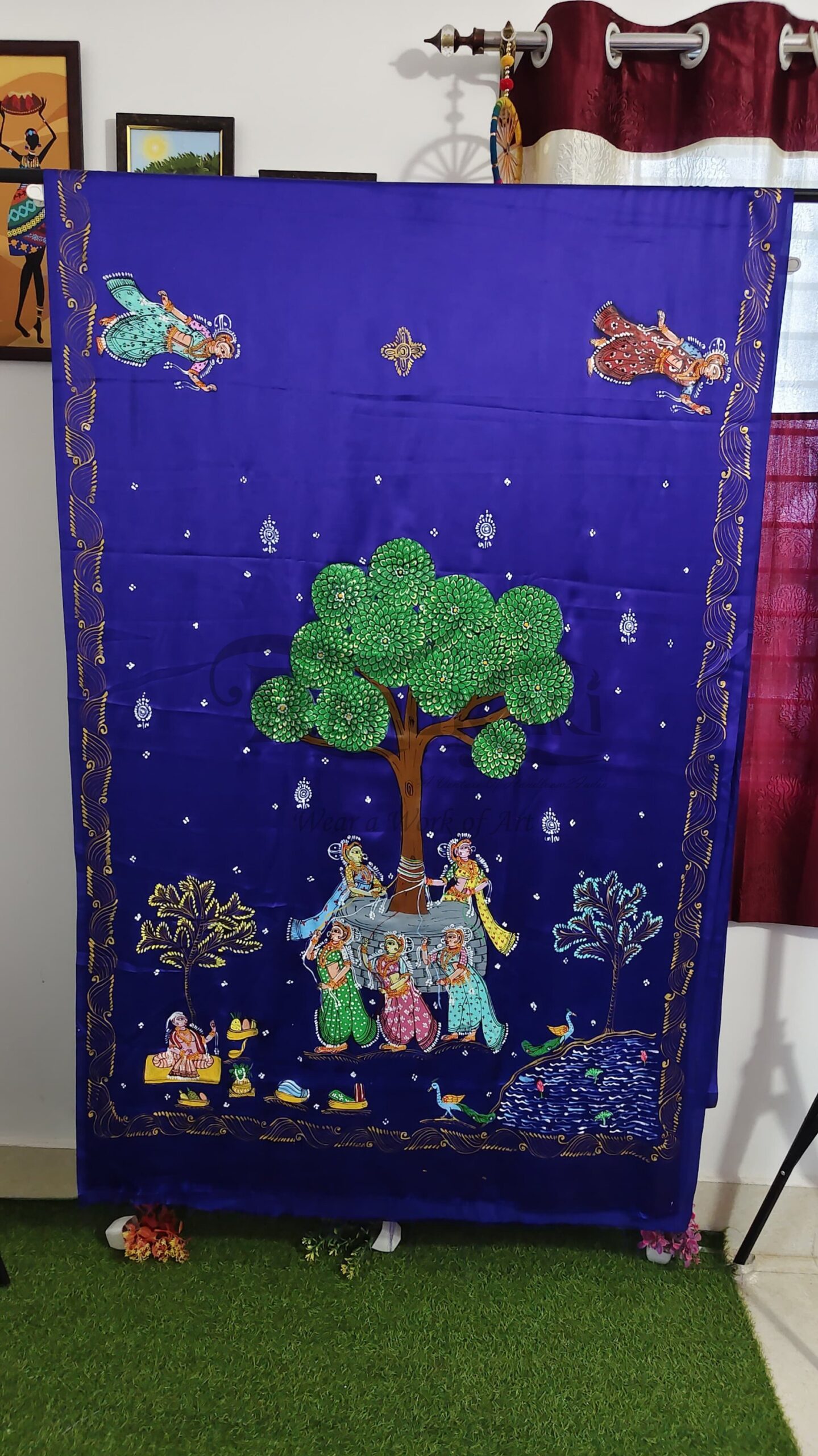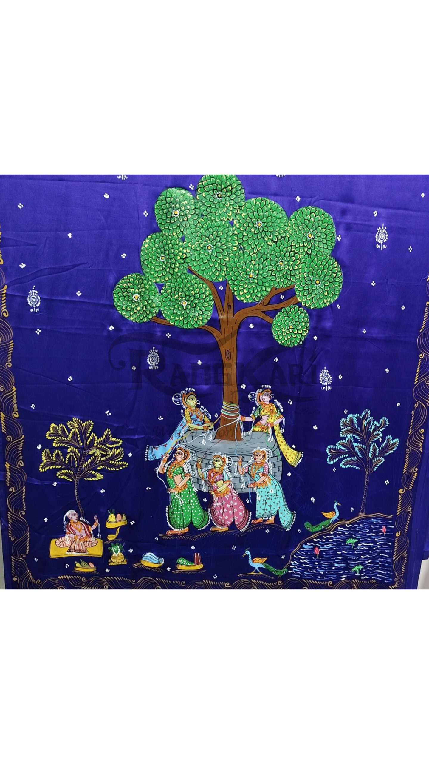 Indulge in the regal charm of Vatashri, a masterpiece of storytelling and traditional craftsmanship. The saree features a detailed hand-painted depiction of the Vat Savitri festival, a sacred ritual where married women pray to the Banyan tree for the longevity and well-being of their husbands.The edges are adorned with intricate golden vine work, featuring peacocks and serene landscapes that complete the story.Crafted on premium satin silk, the saree offers a captivating glossy finish and a heavy, liquid-like drape that enhances the wearerโs silhouette.
